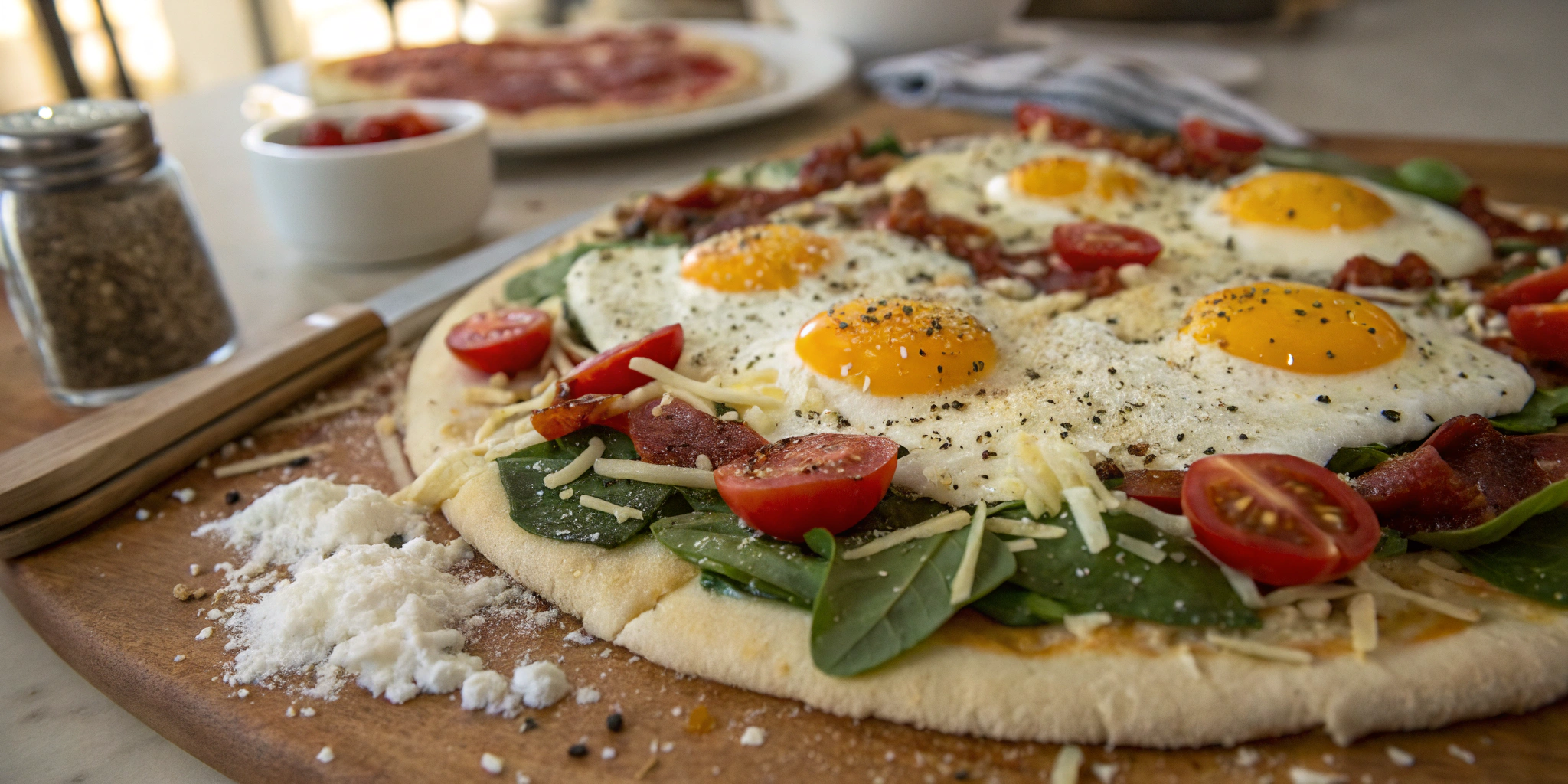 [IMAGE: Breakfast pizza served on a rustic wooden table with vibrant toppings]
